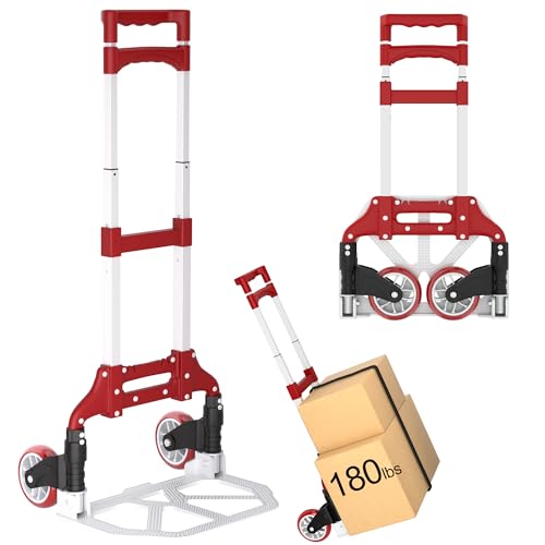 Folding Hand Truck - Aluminum Portable Dolly Cart with Telescopic Handle, Bungee Cord - Compact Lightweight Foldable Luggage Cart for Moving, Home, Auto, 180lbs, Red $47.05
