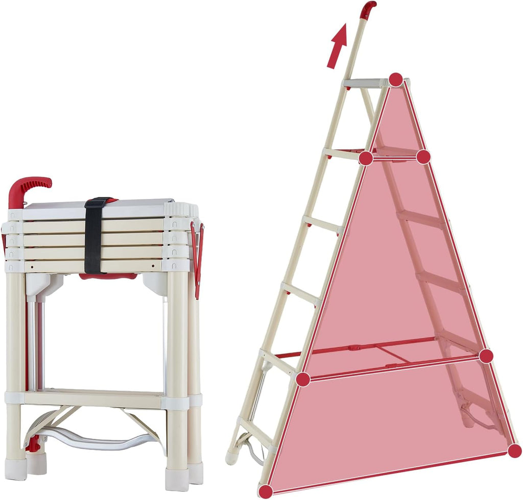 Ladder - A-Frame Telescoping Extension Ladder with Step-Triggered Auto Retraction, Aluminum Foldable Design, 330lbs Capacity for Home Use, White & Red