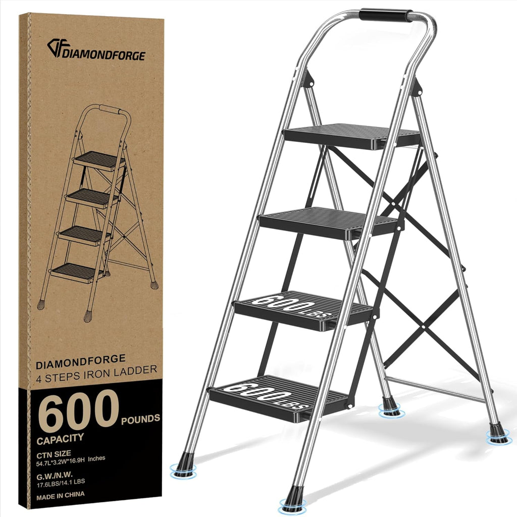 Heavy-Duty Performance and Durability - 4 step stool ladder that's built to last, with the capacity to hold up to 600 pounds , is ideal for heavy-duty use. Crafted from thickened 9mm Alloy Steel, these ladders are resistant to wear, corrosion, rust, and temperature extremes, ensuring long-lasting performance and durability. They are perfect for ladders for home and step stools for adults, providing a reliable solution for all your height-related needs.