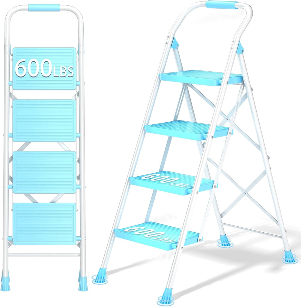Step Ladder Foldable Folding Stool - for Home Adults Kitchen 4 Stepping Extension Tall Heavy Duty with Handrails - Closet Stepstool Stair Ladders Extendable Stepladder for Indoor House 600Lbs